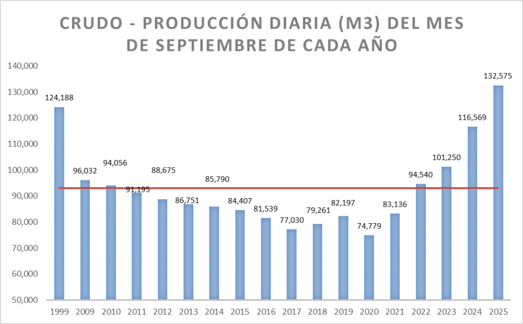 La producción diaria promedio de petróleo crudo de septiembre de 2025 fue la mayor de esos mismos meses, superando, incluso, a la del año 1999.