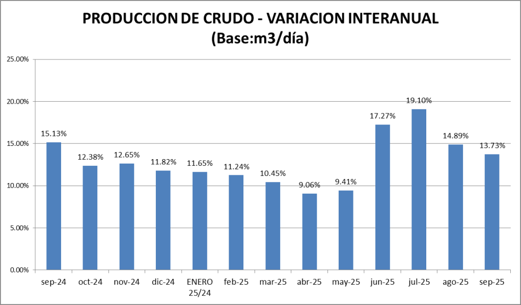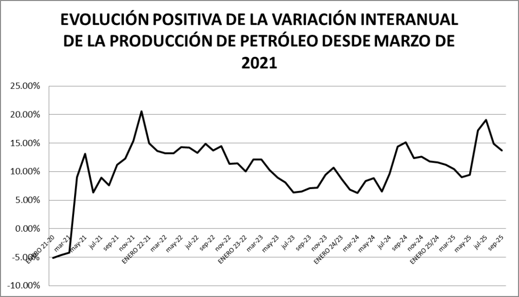 En el mes de septiembre de 2025, en petróleo crudo, se muestra un crecimiento interanual un poco menor que los dos meses anteriores.