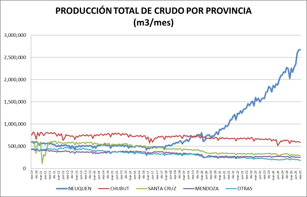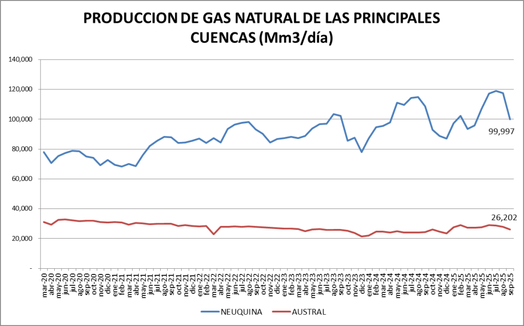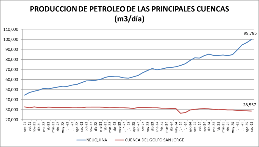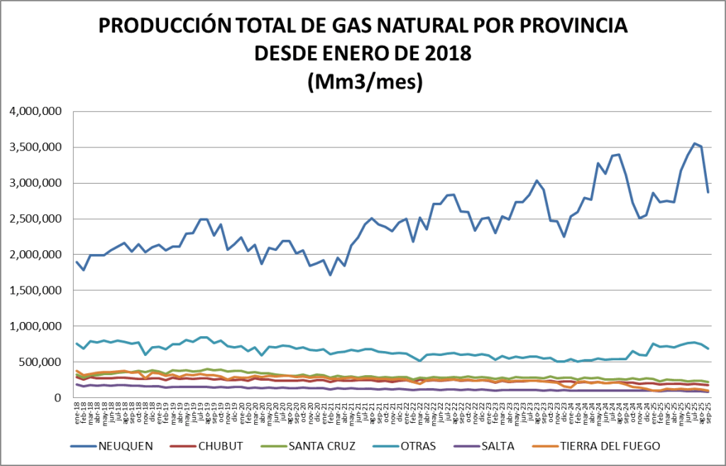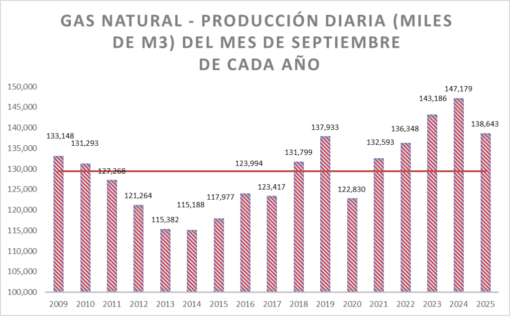 De la producción histórica de nuestro país solamente supera a la de septiembre de 2025 la del año 1998 (récord histórico) que fue de 134.651 m3 diarios.