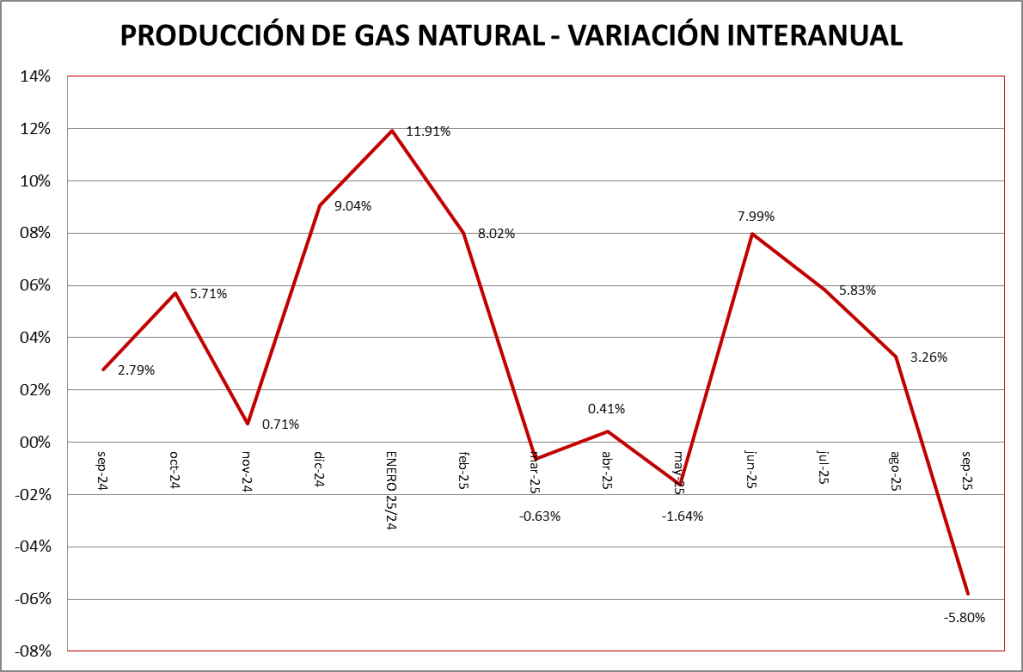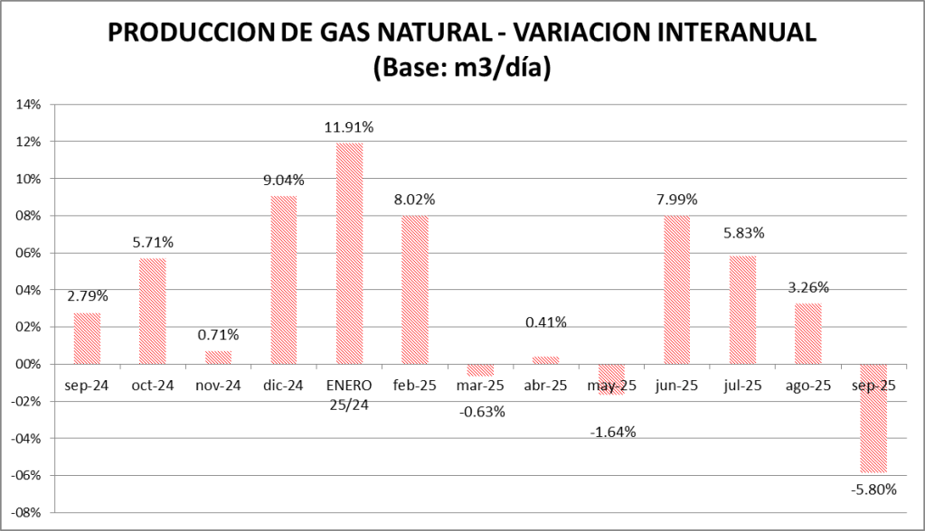 En el caso del gas natural se nota claramente la salida del invierno con una evolución negativa respeto a septiembre de 2024.