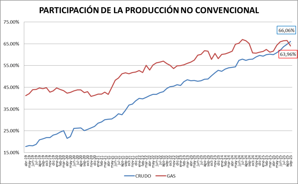 La participación del crudo no convencional en el total de la producción nacional fue, en septiembre de 2025, del 66,06%, y se constituye en un nuevo récord.