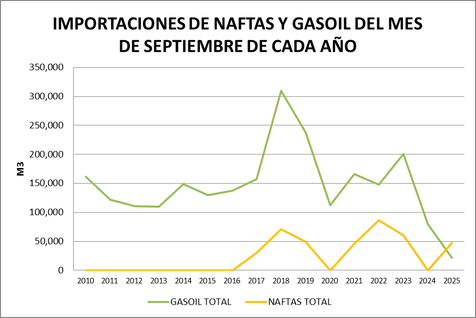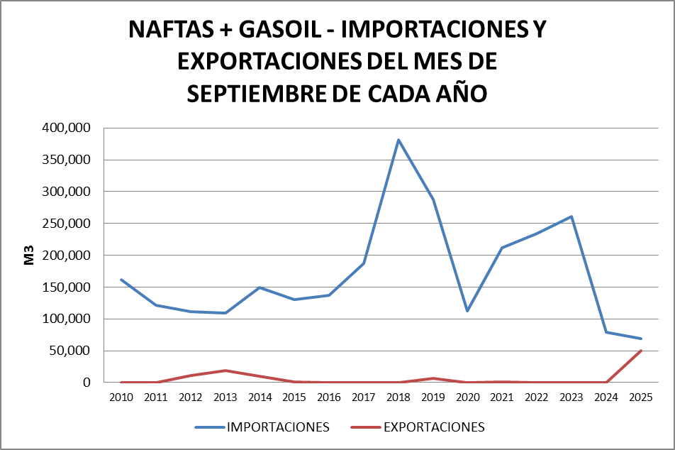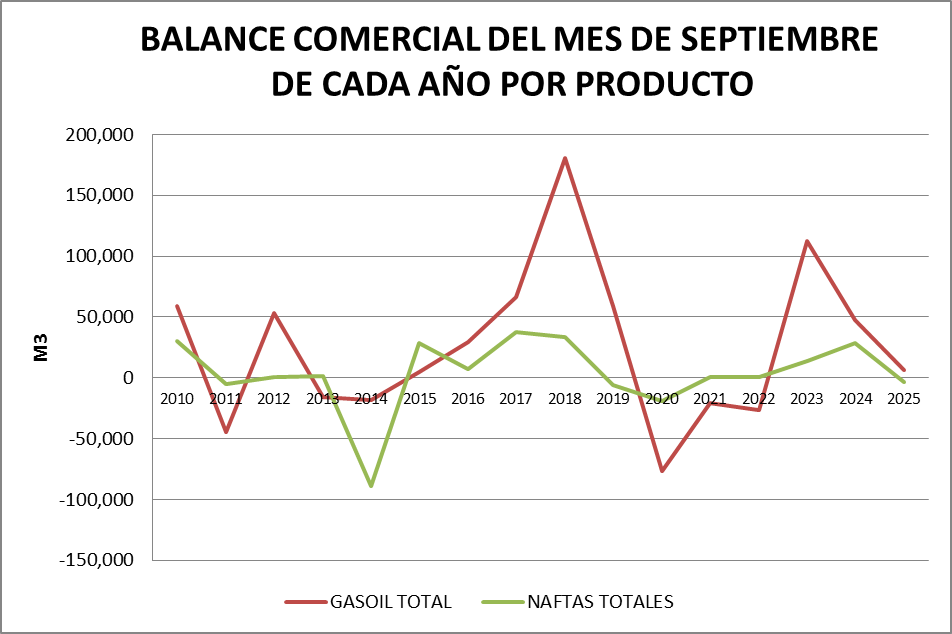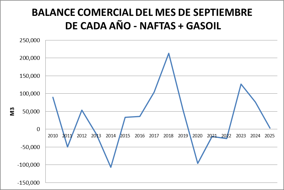 Para el análisis que presentamos a continuación, que tiene como objetivo realizar un Balance Comercial, tomaremos los volúmenes de nafta grado 2, nafta grado 3, gasoil grado 2 y gasoil grado 3, correspondientes al mes de septiembre de cada año (último dato disponible).