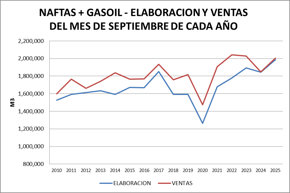 Históricamente las ventas superan a la elaboración y ese déficit es cubierto por importaciones. En septiembre de 2025 las ventas y la elaboración se muestran de la siguiente forma: