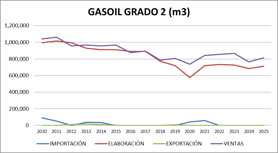 | AÑO | Gasoil Grado 2 (Común) | Gasoil Grado 3 (Ultra) | Nafta Grado 2 (Súper) | Nafta Grado 3 (Ultra) | TOTAL |