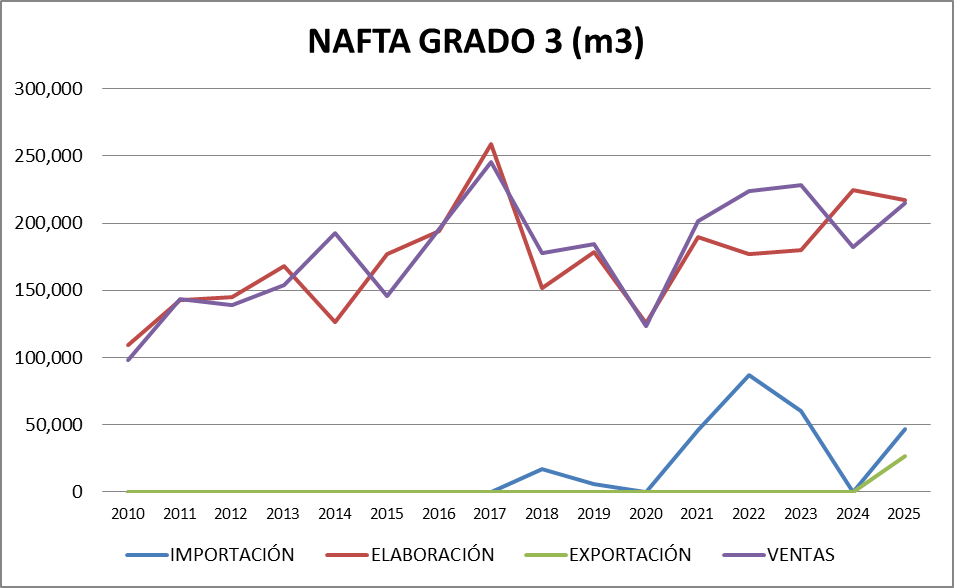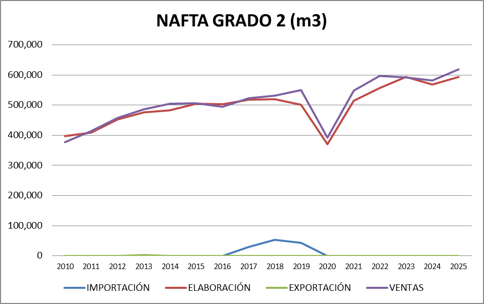 Puede verificarse gráficamente que la elaboración converge hacia el valor de las ventas y coincide con la baja importación registrada. Además, la elaboración ha ido creciendo a la luz de un mayor procesamiento de petróleo crudo en refinerías.