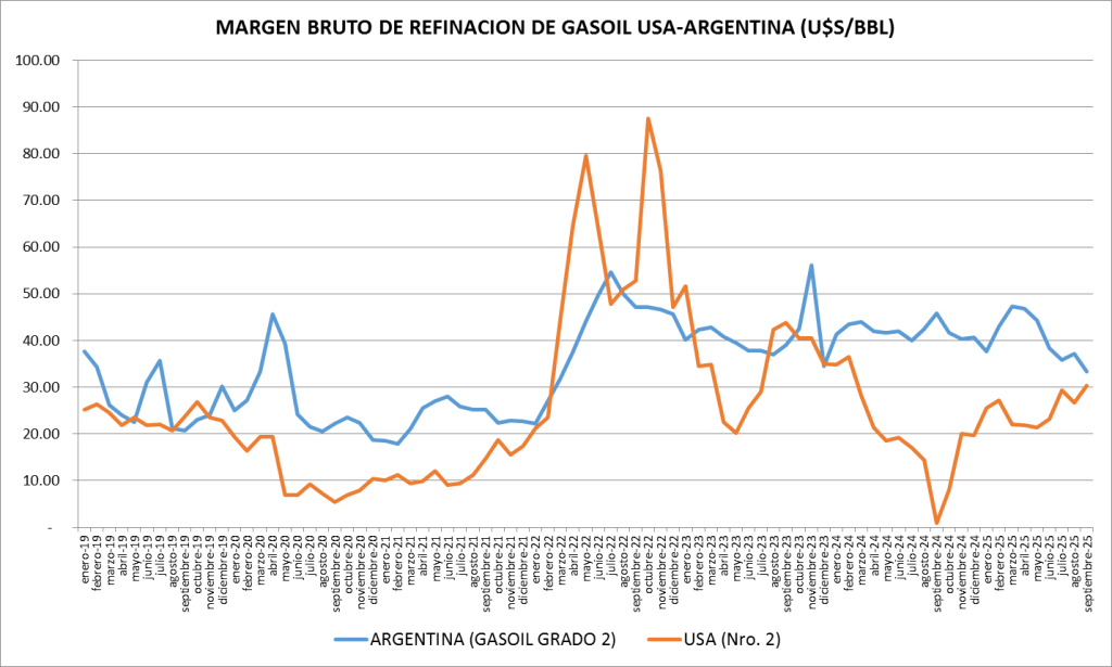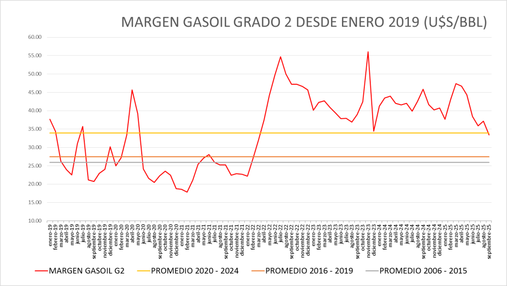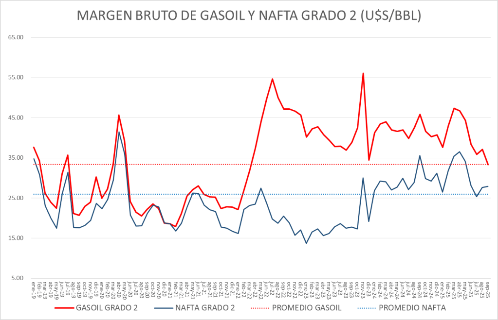 El Margen del gasoil grado 2 de agosto de 2025 (33,37 u$s/bbl) prácticamente iguala el promedio del período enero de 2017 a septiembre de 2025 (33,39 u$s/bbl).