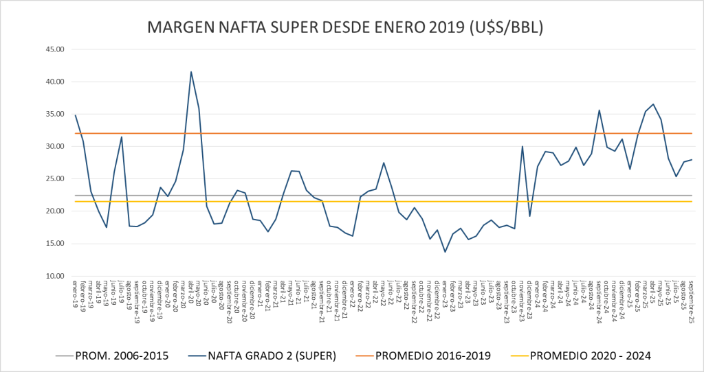 El margen bruto de la nafta super, en septiembre de 2025, está por debajo del promedio 2016-2019.
