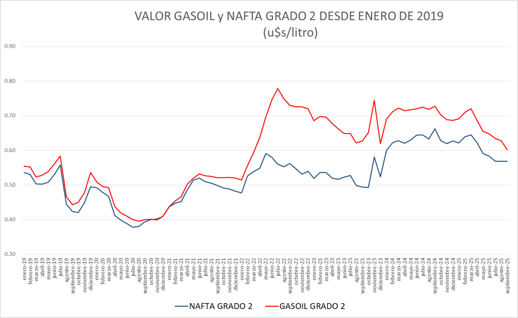 | En u$s/litro | NAFTA GRADO 2 | GASOIL GRADO 2 |