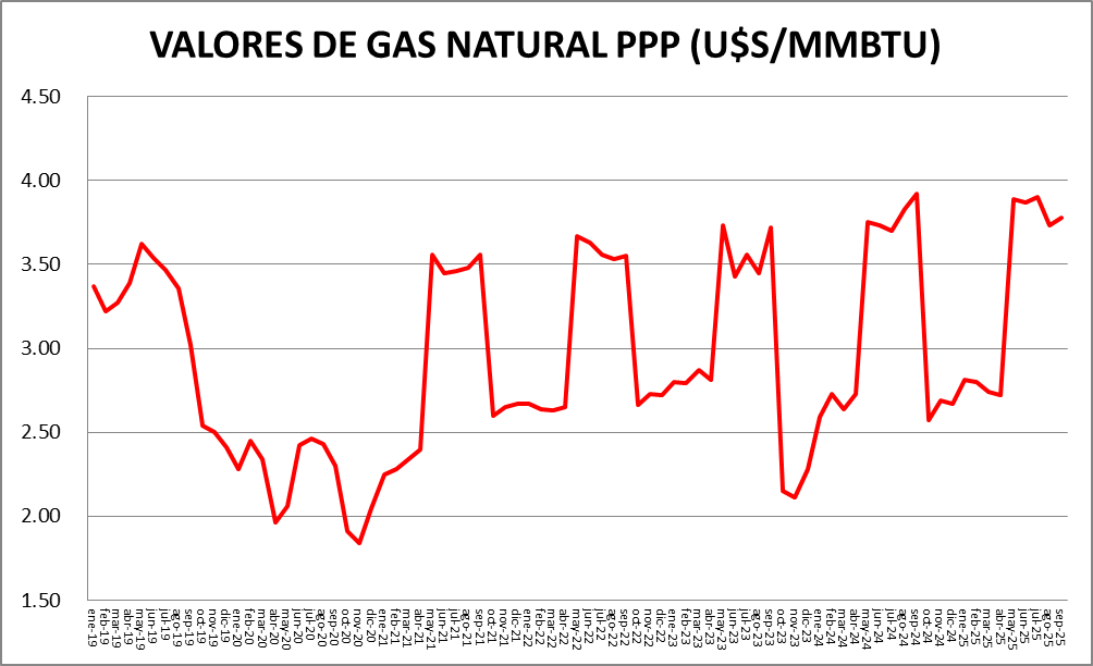 El precio del gas natural dirigido a la generación eléctrica, en septiembre de 2025, subió un 1,06% respecto a agosto y es un 4,08% menor al de septiembre de 2024.