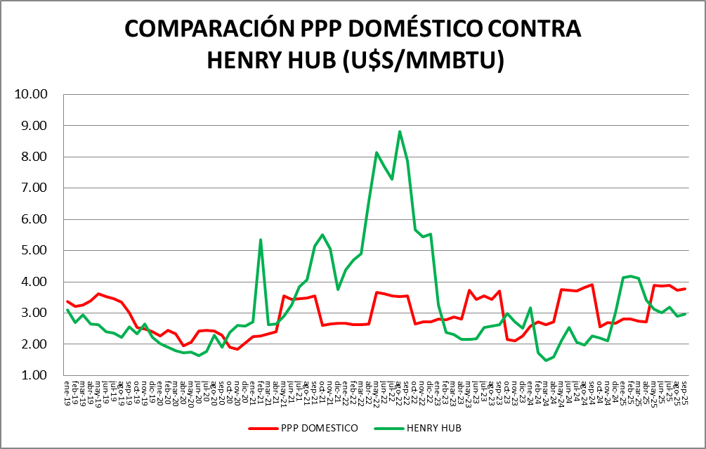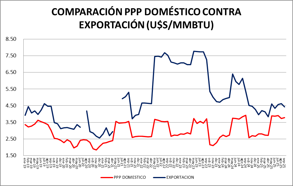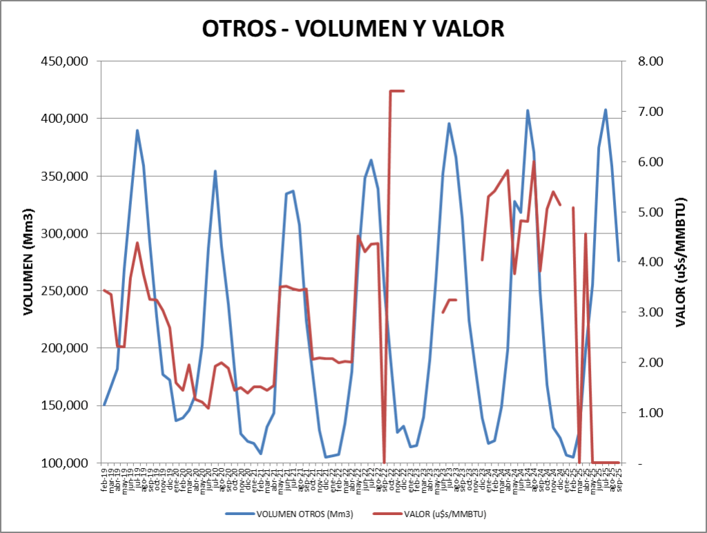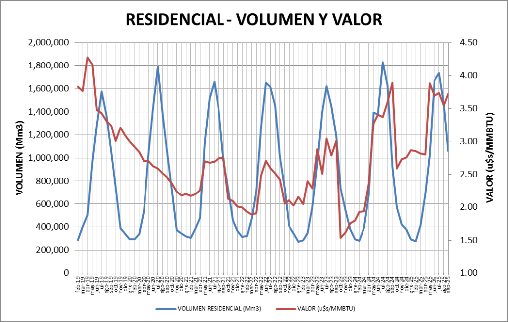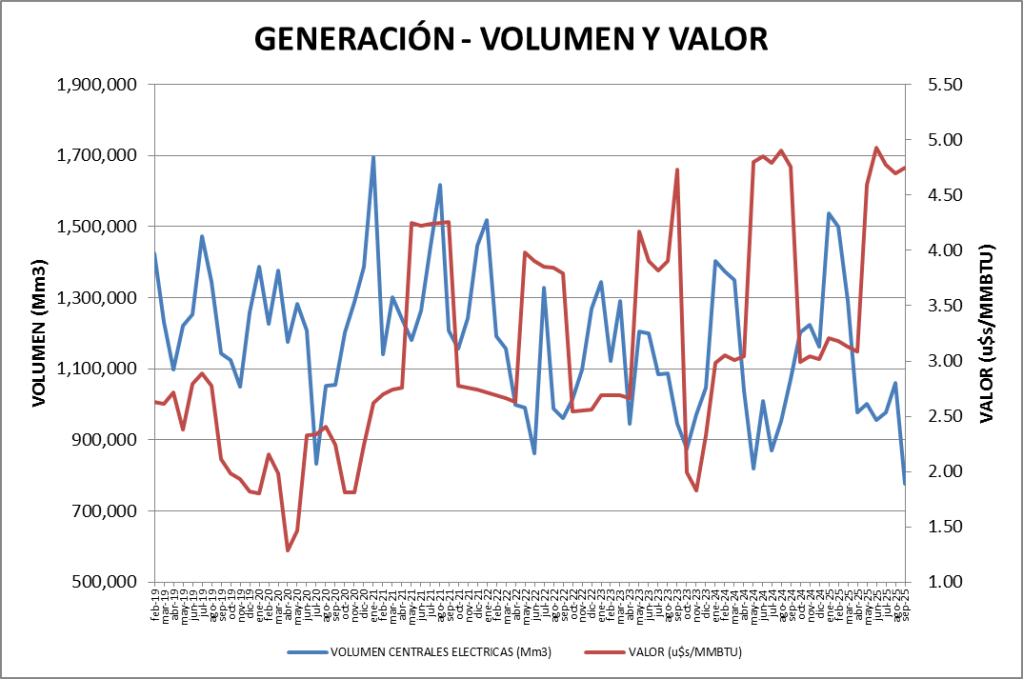 En cuanto al volumen, se consumieron 25,89 MMm3/día en promedio 24,23% menos que el mes anterior y 27,49% por debajo de septiembre de 2024.