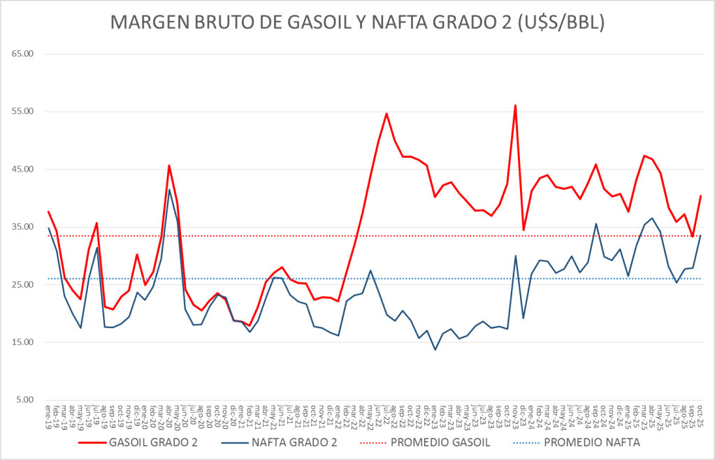 El Margen del gasoil grado 2 de octubre de 2025 (40,37 u$s/bbl) supera el promedio del período enero de 2017 a octubre de 2025 (33,46 u$s/bbl).