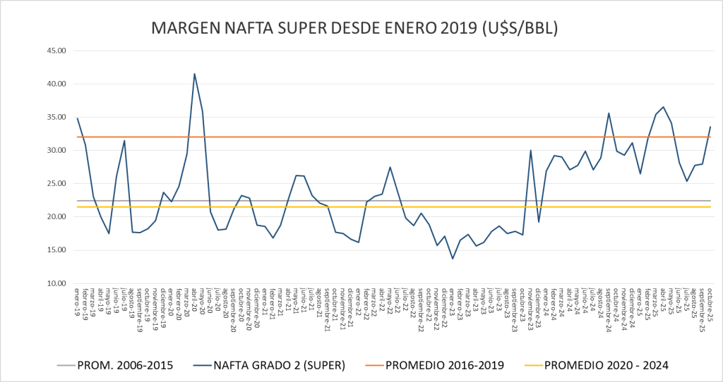 El margen bruto de la nafta super, en octubre de 2025, supera a los tres promedios de referencia.