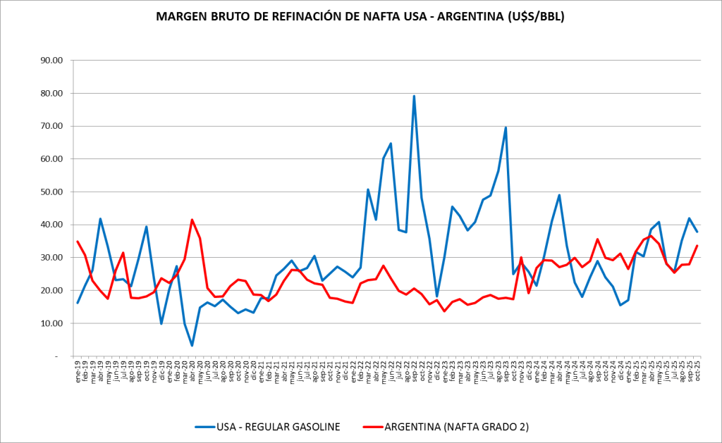 En octubre de 2025 el Margen Bruto de Refinación de la nafta súper sube un 20,06% y el del gasoil cae un 20,97%, ambos respecto al mes anterior.