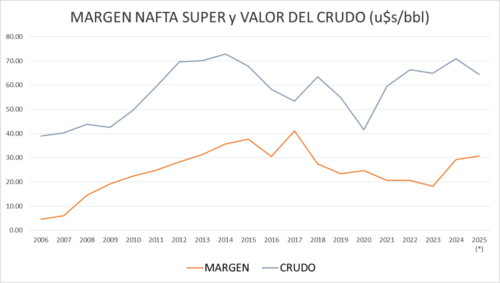 A pesar del ascenso, el margen de la nafta súper se ubica un 5,67% por debajo del de un año atrás, mientras que el del gasoil está un 12,00% también por debajo del de octubre de 2024.