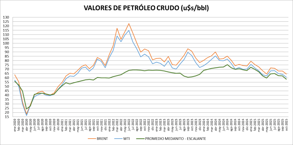 El promedio nacional de octubre 2025 es de 58,48 dólares por barril.