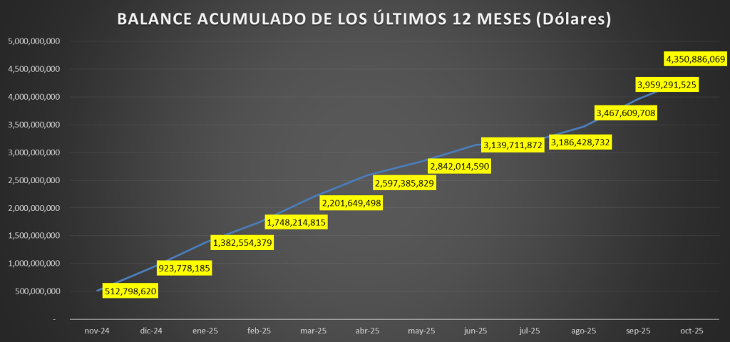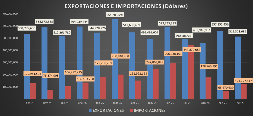 Las importaciones totales en octubre de 2025 fueron de 121,7 MMu$s y las exportaciones de 513,3 MMu$s, resultando un balance positivo de 391,6 MMu$s.