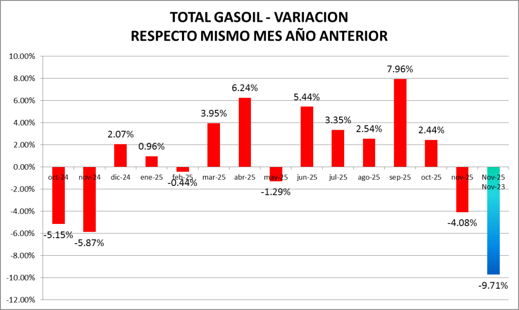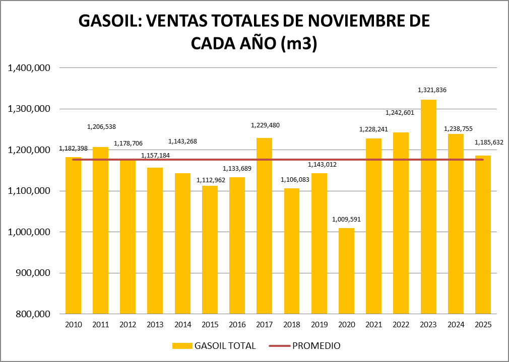 Con respecto a octubre de 2025, las ventas totales de gasoil fueron un 0,56% menor, considerando la corrección por mayor número de días de este mes.
