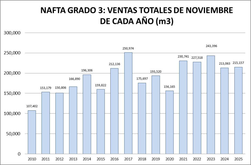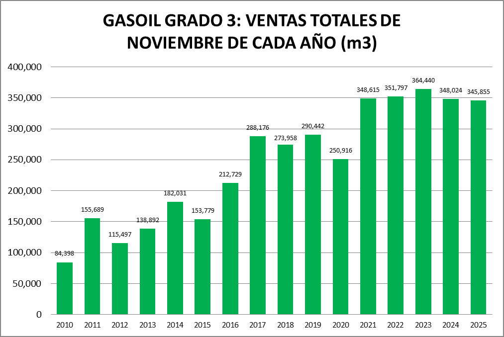 Agregamos también las ventas de nafta de alto octanaje (grado 3) donde notamos que los valores de noviembre de 2025 no son mayores a los registrados en varios de los años del período.