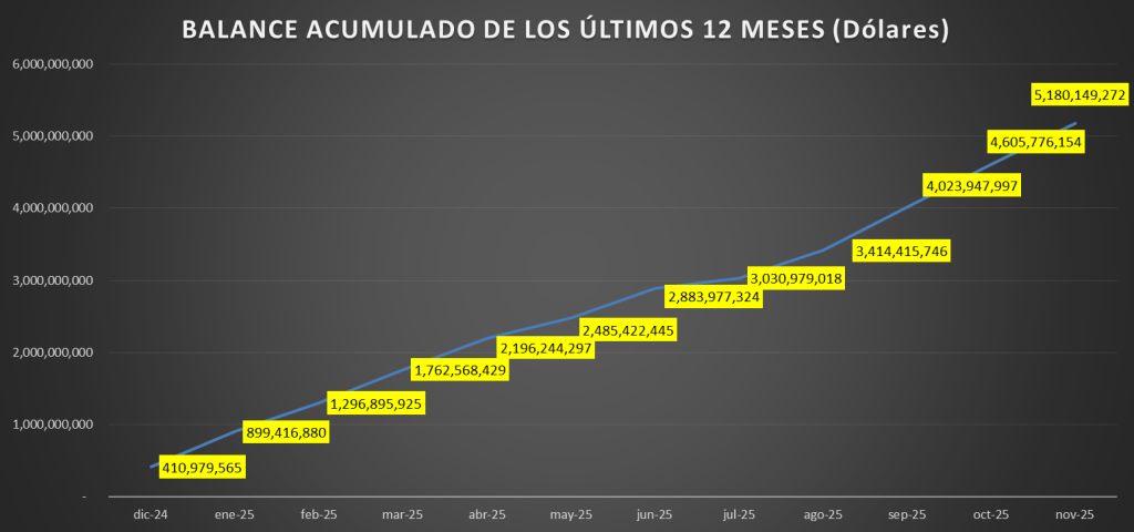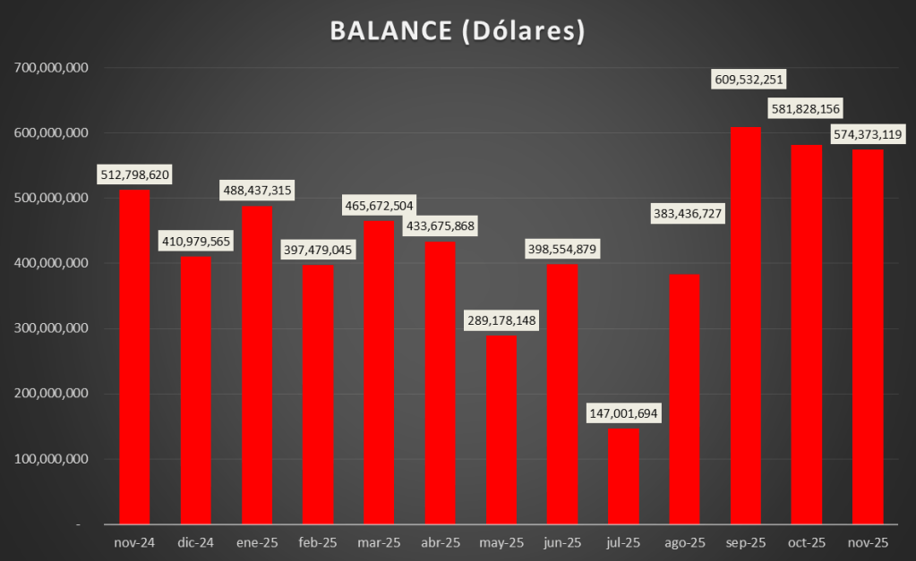 Las importaciones totales en noviembre de 2025 fueron de 72,99 MMu$s y las exportaciones de 645,37 MMu$s, resultando un balance positivo de 574,37 MMu$s.