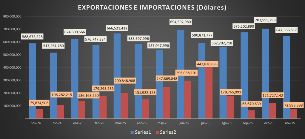En noviembre de 2025 las importaciones bajaron, respecto de octubre de 2025, un 40,04%, mientras que las exportaciones también bajaron pero un 7,99%.