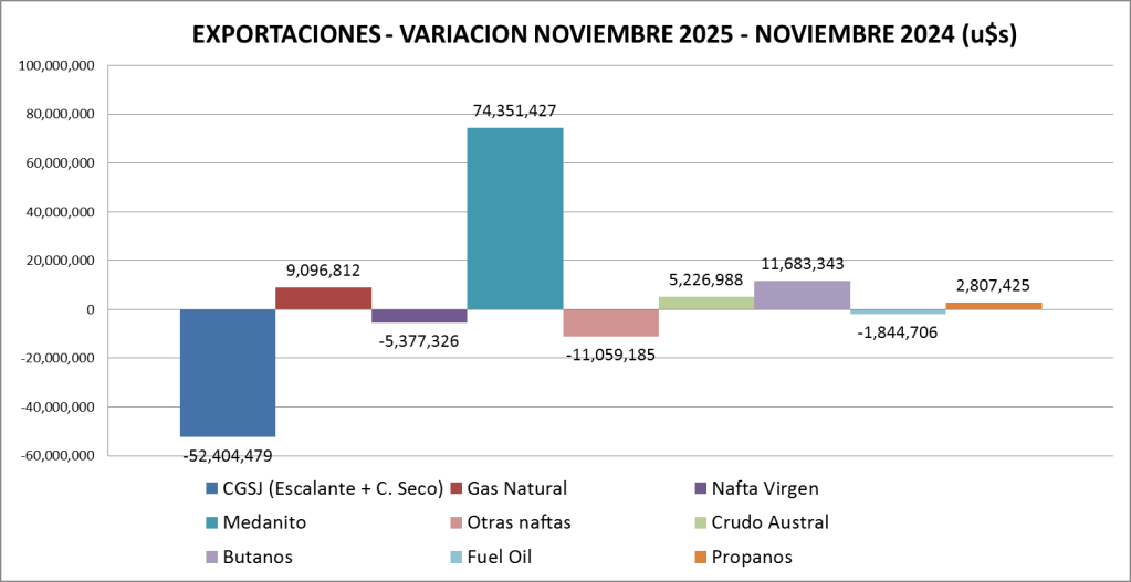 Se exportaron, además, 1.027.577 m3 de crudo Medanito con un valor promedio de 61,37 u$s/bbl. Son 6.463.457 barriles que generaron un ingreso de 396,68 millones de dólares.