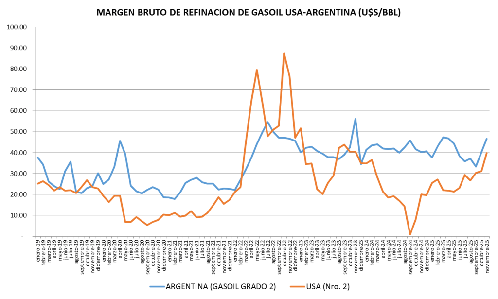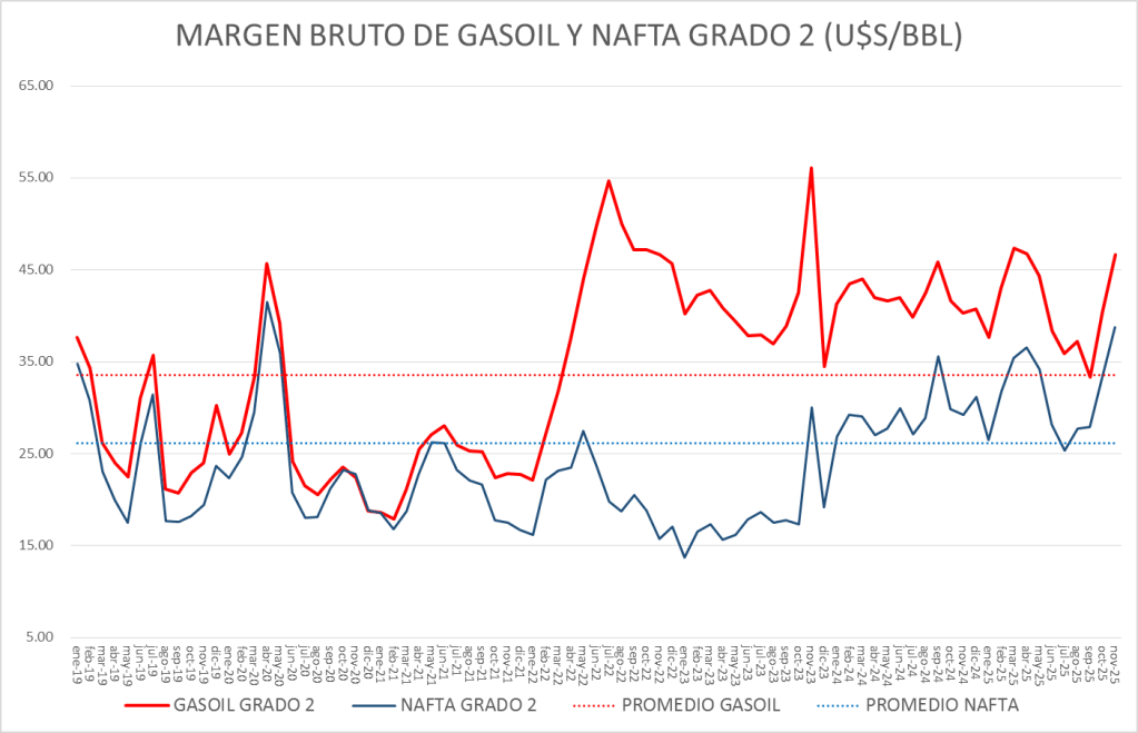 En noviembre de 2025 el Margen Bruto de Refinación de la nafta súper sube un 15,50% y el del gasoil un 15,58%, ambos respecto al mes anterior.