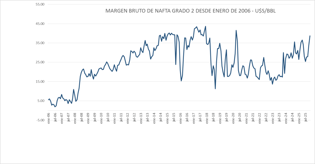El Margen del gasoil grado 2 de noviembre de 2025 (46,66 u$s/bbl) supera el promedio del período enero de 2017 a noviembre de 2025 (33,58 u$s/bbl).
