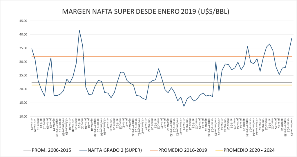 El margen bruto de la nafta súper, en noviembre de 2025, supera a los tres promedios de referencia.