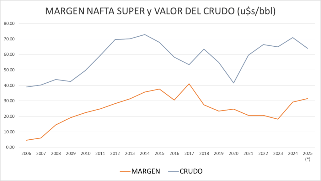 | Año | Valor nafta (u$s/litro) | Margen (u$s/bbl) | Crudo promedio (u$s/bbl) |
