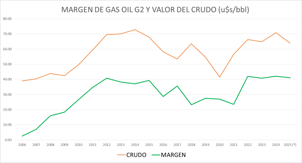 | Año | Valor gasoil (u$s/litro) | Margen (u$s/bbl) | Crudo promedio (u$s/bbl) |