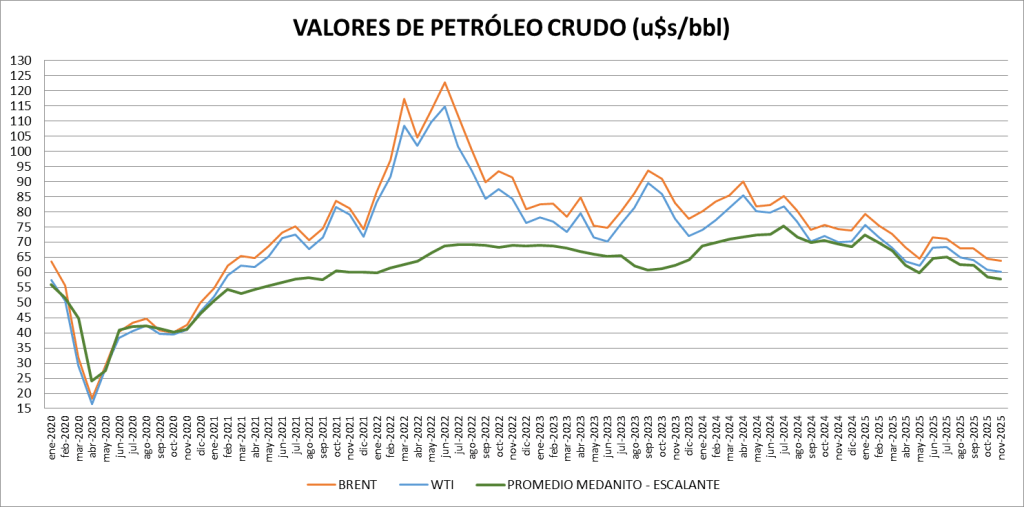 El promedio nacional de noviembre 2025 es de 57,89 dólares por barril.