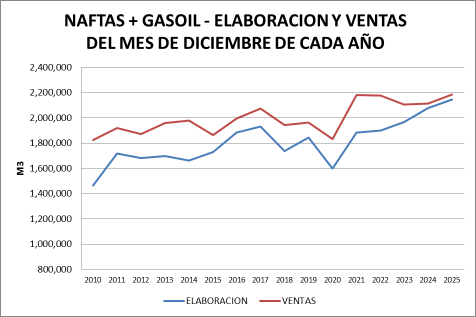 Históricamente las ventas superan a la elaboración y ese déficit es cubierto por importaciones. En diciembre de 2025 las ventas y la elaboración se muestran de la siguiente forma: