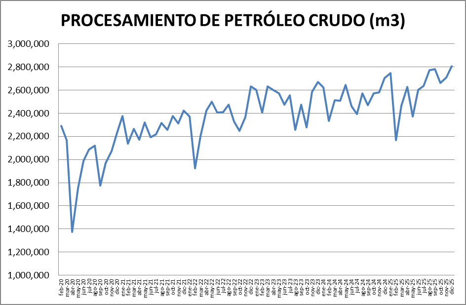 En diciembre de 2025, el procesamiento de petróleo crudo subió un 3,53% respecto del mes anterior. Respecto a diciembre de 2024, se procesó un 3,64% más.
