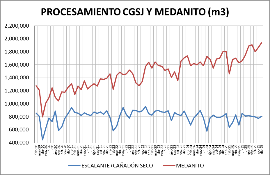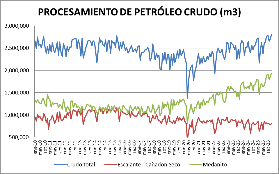 Escalante-Cañadón Seco: Se procesó, en diciembre de 2025, un 3,63% más que en noviembre de 2025 y un 0,95% por debajo de diciembre de 2024.