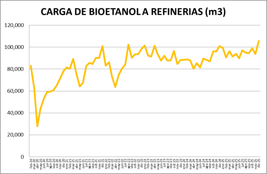 En cuanto al bioetanol, se utilizó en diciembre de 2025, un 12,83% más que en noviembre de 2025.