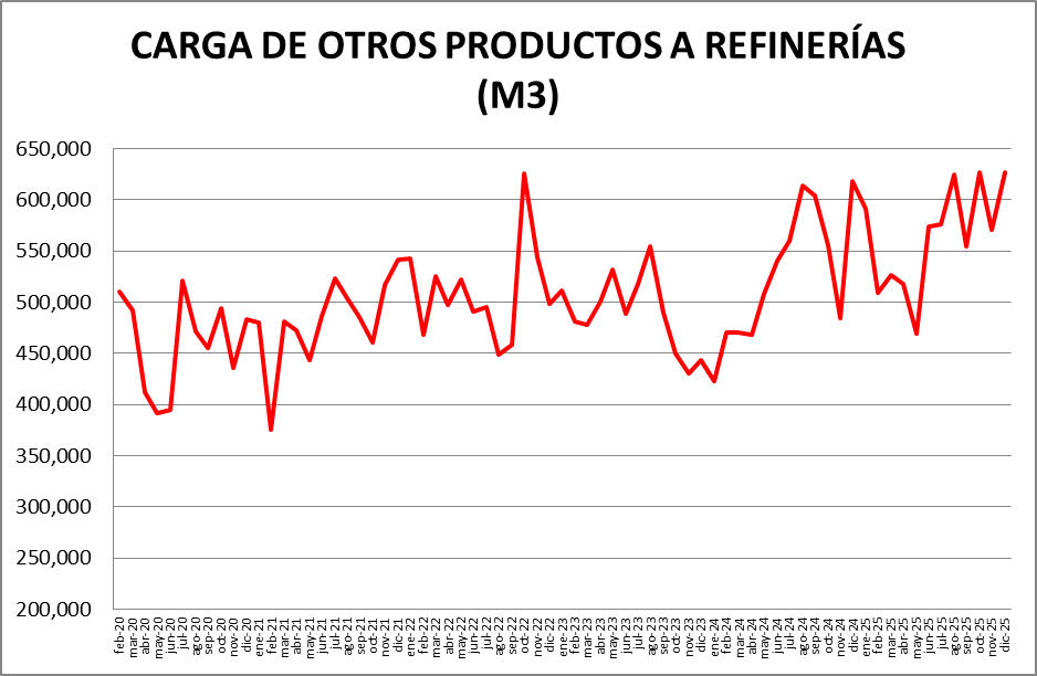 Dentro del rubro “Otras cargas” donde ” se encuentran: naftas sin terminar, mejoradores octánicos, cortes de gasoil, nafta virgen, cortes de kerosene, nafta reformada, destilado de vacío, etc., la evolución fue la siguiente: respecto a noviembre de 2025: +9,74%; respecto a diciembre de 2024: +1,44%.