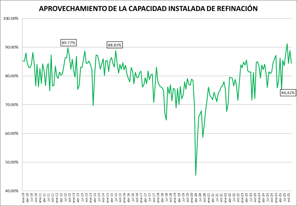 REFINOR vuelve a no tener actividad en diciembre. El aprovechamiento de la capacidad instalada de las principales refinerías fue de 84,42%, menor a la del mes anterior que había sido de 88,84%.
