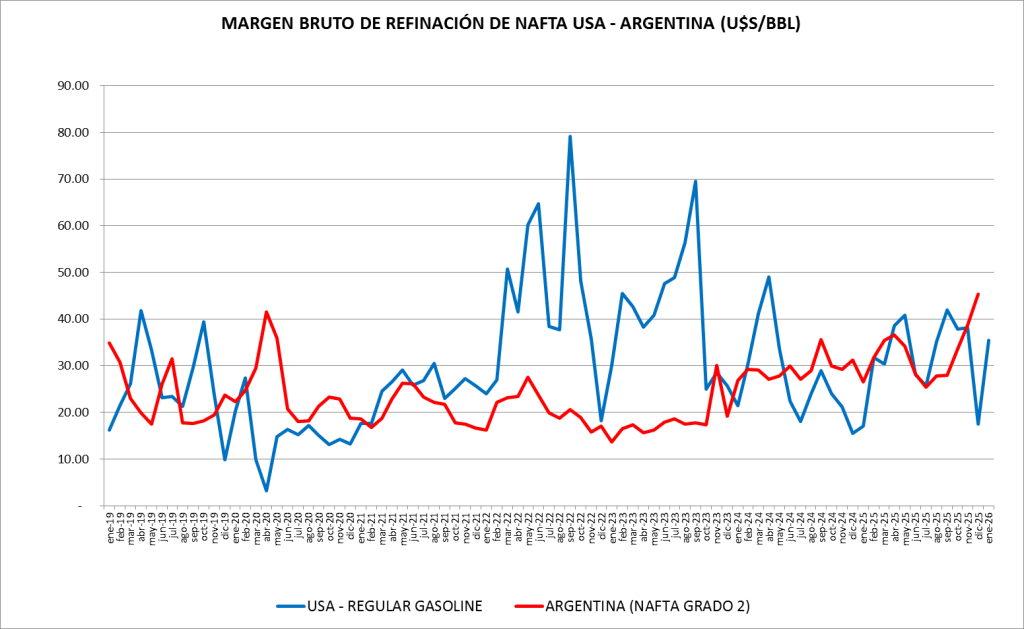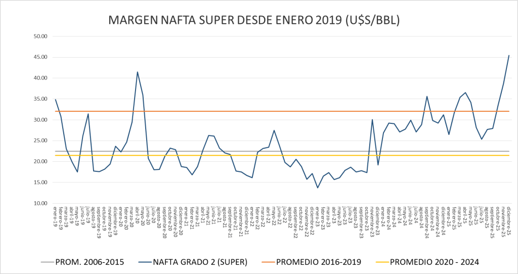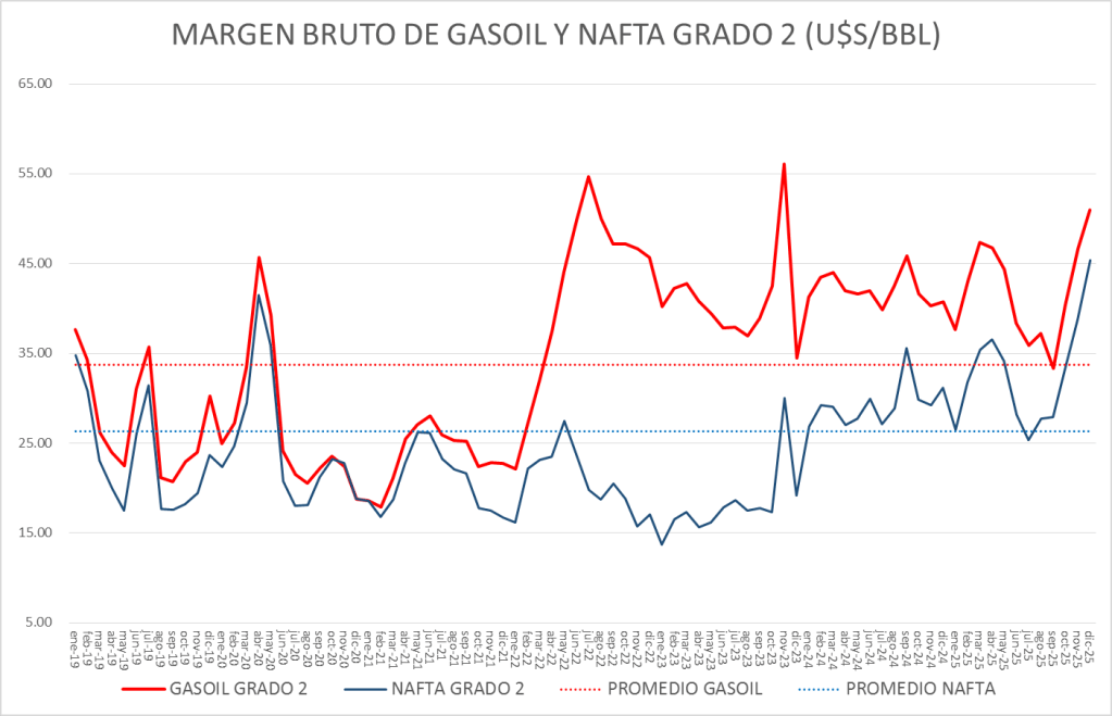 En diciembre de 2025 el Margen Bruto de Refinación de la nafta súper sube un 17,16% y el del gasoil un 9,17%, ambos respecto al mes anterior.