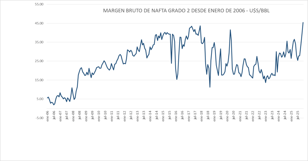 El Margen del gasoil grado 2 de diciembre de 2025 (50,94 u$s/bbl) supera el promedio del período enero de 2017 a diciembre de 2025 (33,74 u$s/bbl).