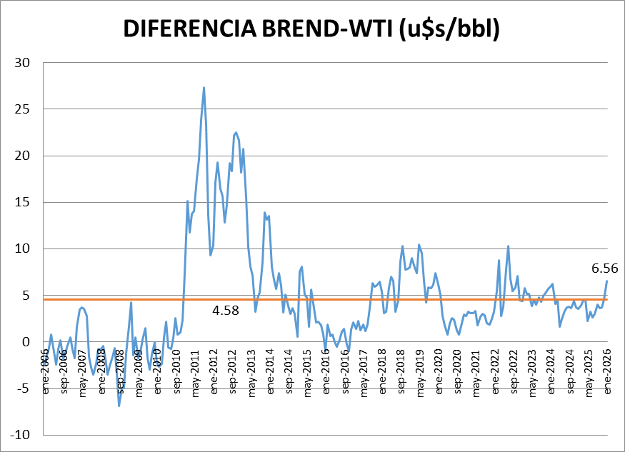 Estamos escuchando repetidamente que el valor “bisagra” del petróleo crudo que hace rentable la explotación de Vaca Muerta está en los alrededores de 65 dólares por barril. En general esta expresión se refiere al valor de la variedad Brent, del Mar del Norte. Últimamente, con los vaivenes internacionales, el valor del Brent se ubica unos 6 u$s/bbl por encima del WTI (West Texas Intermediate) cuando el promedio histórico es de 4,6 u$s/bbl.