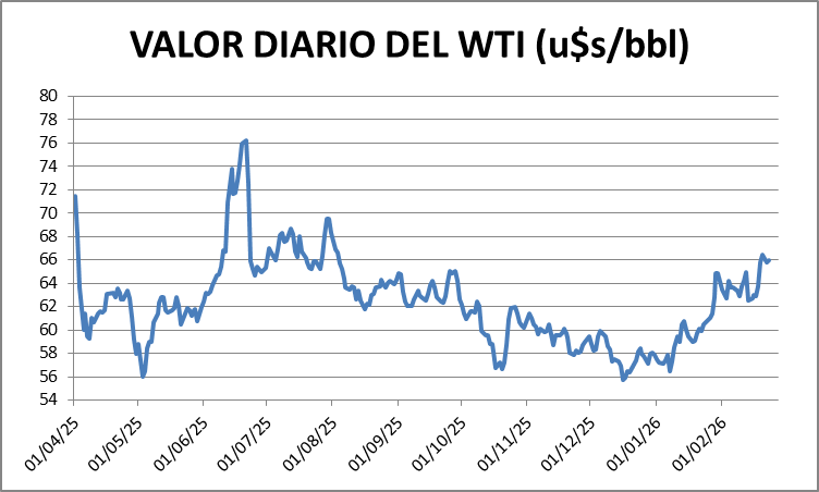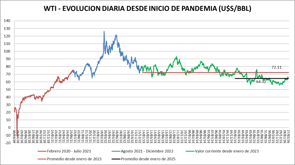 El promedio desde enero de 2023 a la actualidad es de 72,11 u$s/bbl, pero el promedio desde enero del año 2025 baja a 64,62 u$s/bbl.