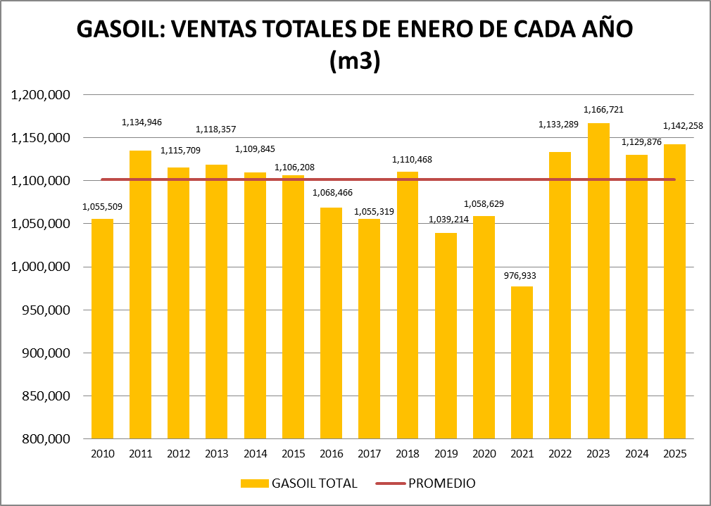 En el gráfico que mostramos a continuación puede verse que la venta de gasoil total en enero de 2026 está por encima del promedio.