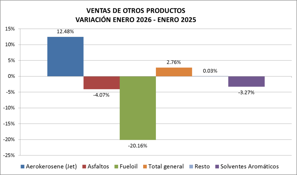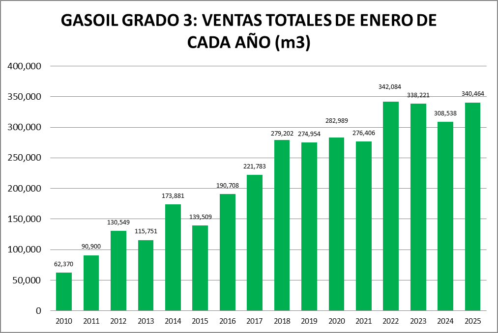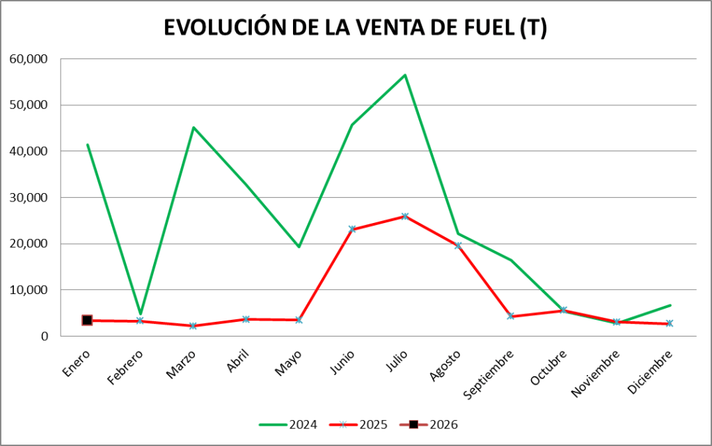 Las ventas de fuel oil registradas en enero son de 3.501 toneladas, cifra similar a la vendida en el año 2025 (3422 t.).
