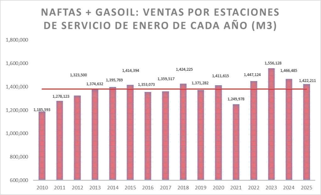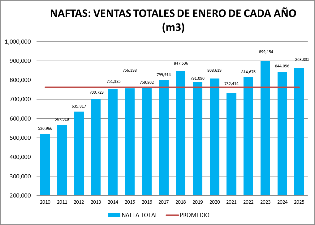 En el caso de las naftas, en enero de 2026, la venta no fue la mejor de la serie. Segundo valor detrás de enero de 2023.