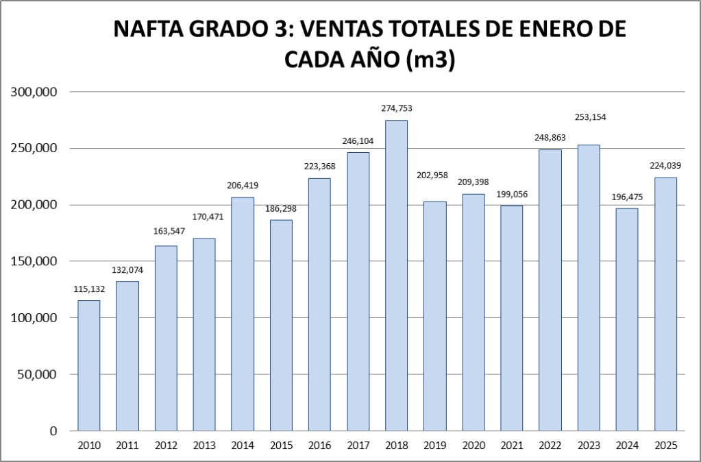 Agregamos también las ventas de nafta de alto octanaje (grado 3) donde notamos que los valores de enero de 2026 no son mayores a los registrados en varios de los años del período.