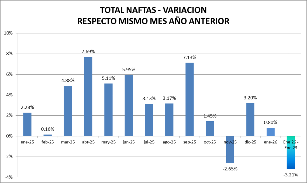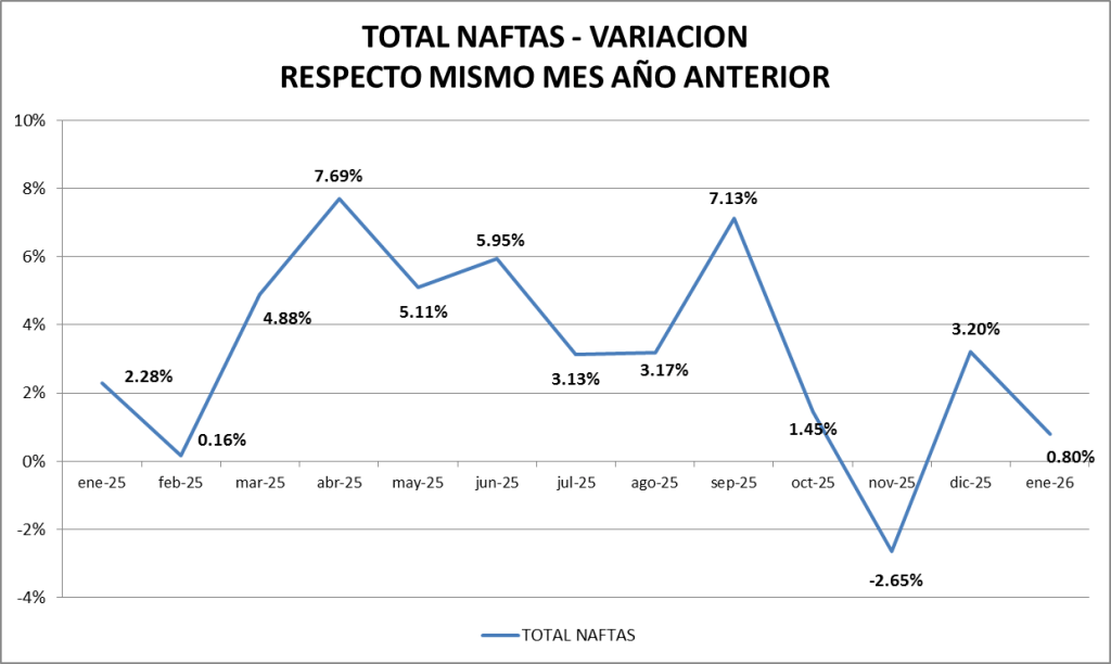 En enero de 2026 las ventas totales de naftas bajaron un 5,43% respecto al mes anterior, y fueron un 0,80% mayor que un año atrás.