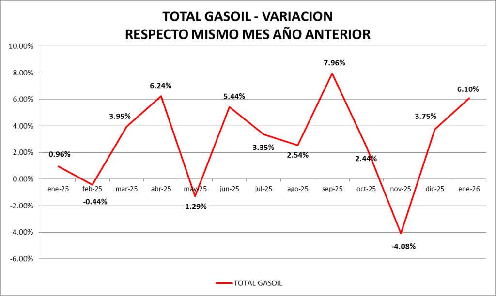 Con respecto a diciembre de 2025, las ventas totales de gasoil fueron un 4,62% menor.