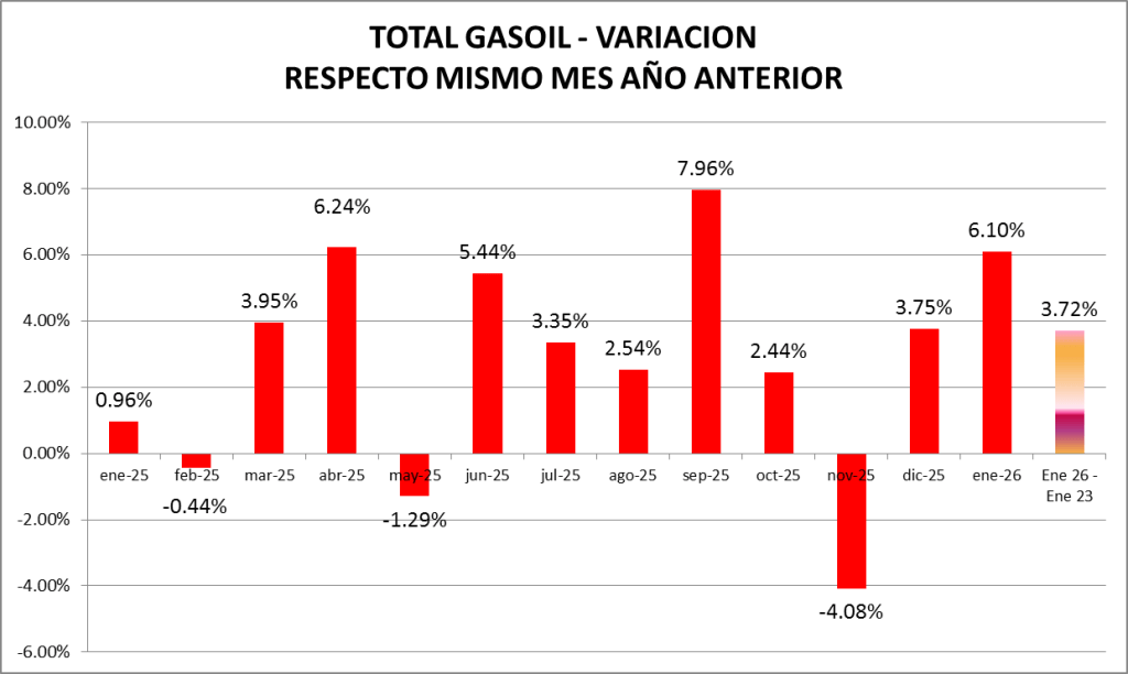 En este caso, las ventas de gasoil total fueron, en enero de 2026, un 3,72% mayor a las de enero de 2023.