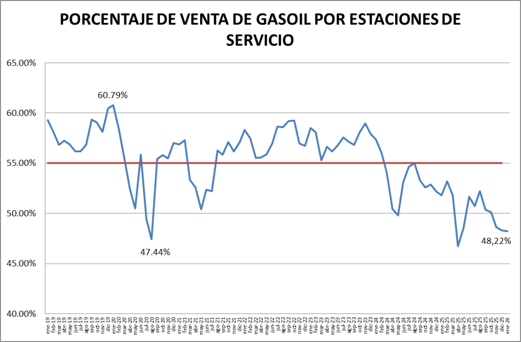 El 48,22% de venta de gasoil por estaciones de servicio es el tercer valor más bajo del período analizado.