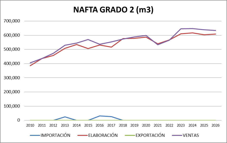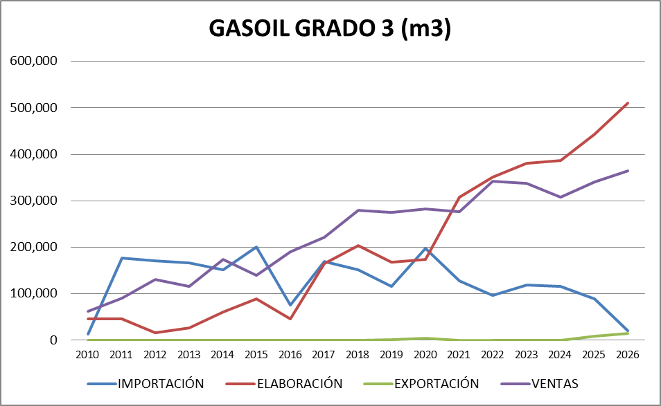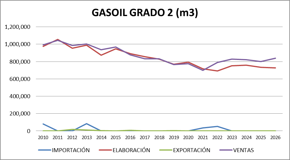 | AÑO | Gasoil Grado 2 (Común) | Gasoil Grado 3 (Ultra) | Nafta Grado 2 (Súper) | Nafta Grado 3 (Ultra) | TOTAL |